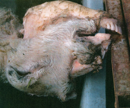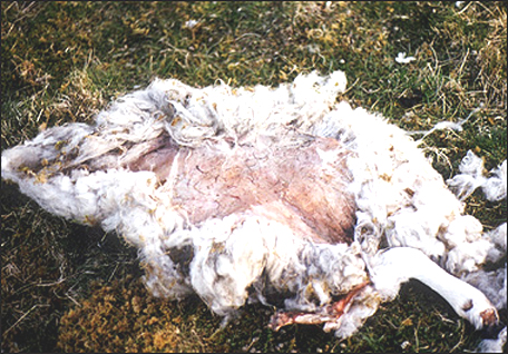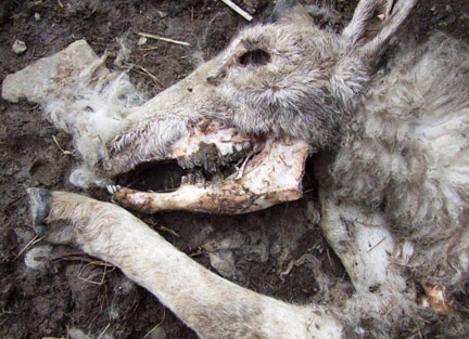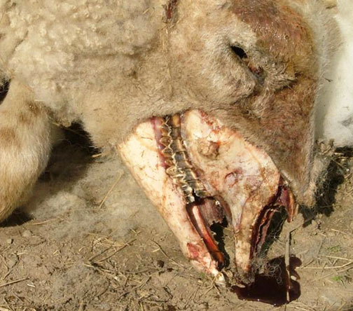 Photo No 4 Le mercredi 13 Janvier 2010 à 15h30, dans une exploitation isolée au milieu des collines, un éleveur trouve un de ses quatre moutons mutilés dans son pâturage couvert de neige. Sur la tête de l’animal, l’os de la mâchoire est proprement dépouillée de toute chair (