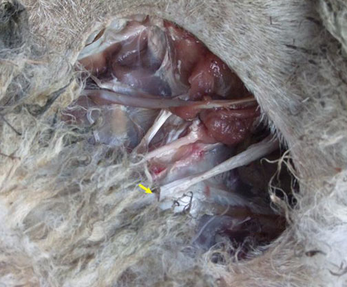 Photo No 1) une deuxième carcasse a été retrouvée avec la tête et une partie des épaules manquantes. La troisième avait les deux yeux et sa mâchoire inférieure, et les tissus du cou excisé. C'est aussi sur celle ci qu’était absente la colonne vertébrale supérieure. La flèche jaune (